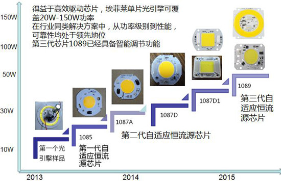 這種智能型LED恒流源徹底打破了教科書里描述的線性恒流源效率很低的常規(guī)認(rèn)識,而破天荒地實現(xiàn)了99%的效率。從而可以實現(xiàn)把恒流源和光源放在同一塊鋁基板上,而做成光電一體化的光引擎。因為它本身的功耗極低,所以把它放到光源的鋁基板上不會增加LED的結(jié)溫。深圳埃菲萊公司采用這種智能型恒流源已經(jīng)生產(chǎn)了一系列不同功率的光引擎: