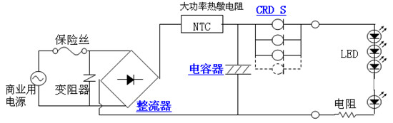 圖中的CRD就是恒流二極管,圖上采用了幾個CRD并聯(lián),以得到所需的恒流值,實際上現(xiàn)在有很多不同恒流值的恒流二極管可供選用,所以也不需要采用并聯(lián)的方法來得到所需的恒流值了。所以只要采用一個恒流值相當(dāng)?shù)暮懔鞫O管和所有LED相串聯(lián)就可以實現(xiàn)對LED的恒流供電,可見它的電路是十分簡單的!